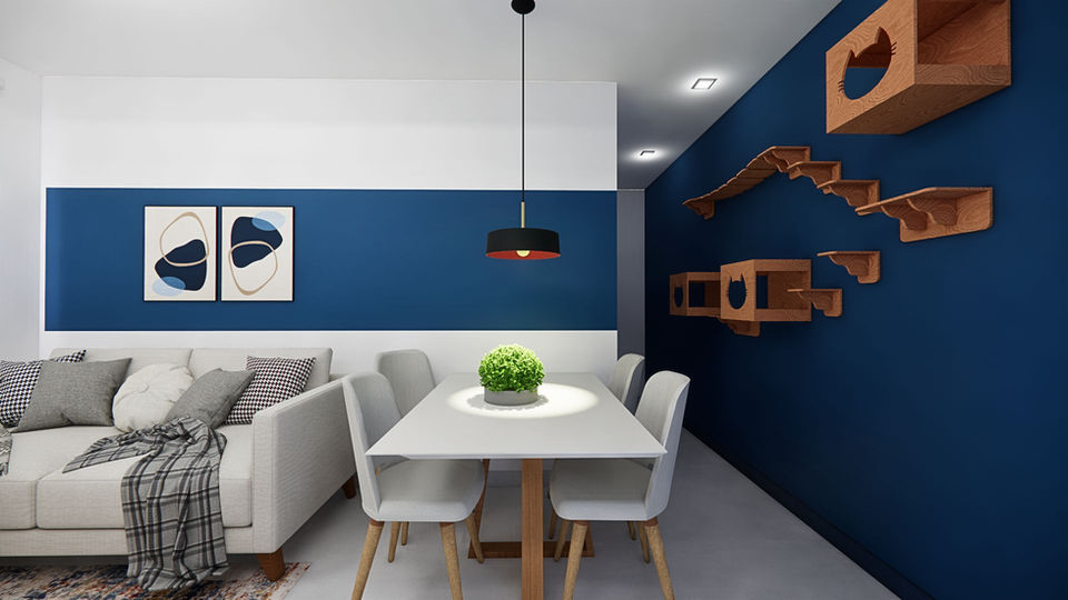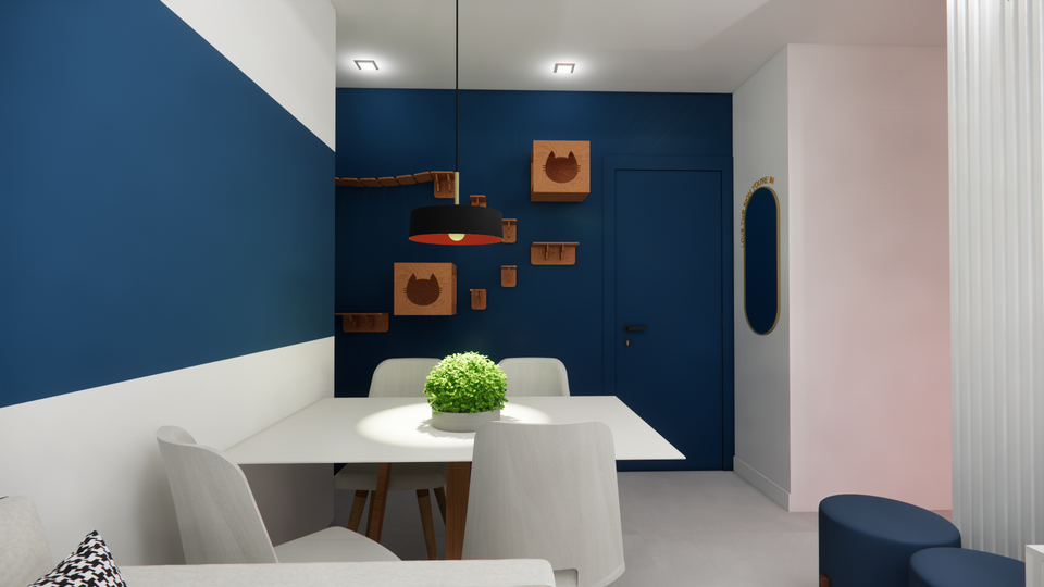 Este espaço contemporâneo foi projetado para equilibrar sofisticação e aconchego, explorando uma paleta marcante de azul profundo contrastando com branco e detalhes amadeirados. O azul traz profundidade e personalidade ao ambiente, enquanto os tons neutros e a madeira conferem equilíbrio e um toque acolhedor.