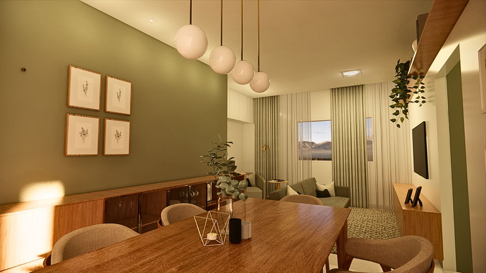 Elementos minimalistas, como quadros botânicos e luminárias esféricas, reforçam a sensação de equilíbrio e tranquilidade. O layout integrado entre sala de jantar, estar e home office otimiza o uso do espaço, combinando estética e praticidade para um refúgio contemporâneo e aconchegante.